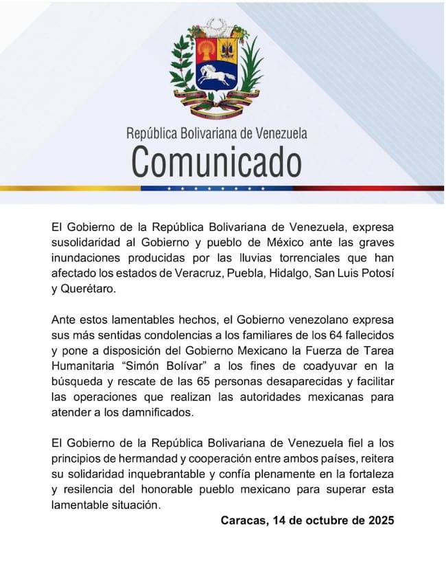 El gobierno de Venezuela ofreció su apoyo a nuestro país en la búsqueda de las 75 personas desaparecidas que dejaron las intensas lluvias en México en Hidalgo, Puebla, San Luis Potosí y Veracruz.