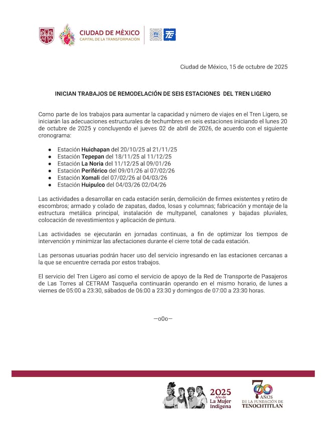 Las labores de remodelación en el Tren Ligero se extenderán hasta abril de 2026, afectando seis estaciones del sur de la capital