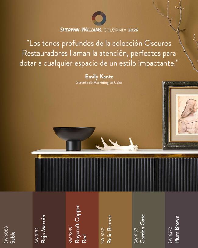 - Oscuros Restauradores: dorado sombreado, rojo cobrizo, ciruelo oscuro, burdeos y azules nocturnos, una elección de profundidad, confort y sofisticación.
