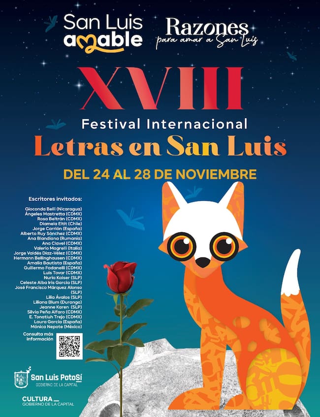 El XVIII Festival Internacional Letras en San Luis Potosí se realizará del 24 al 28 de noviembre en la capital potosina. Durante esos días, escritoras y escritores de México, América Latina y Europa sostendrán lecturas, talleres, mesas de diálogo y firmas de libros en 13 sedes de la ciudad.