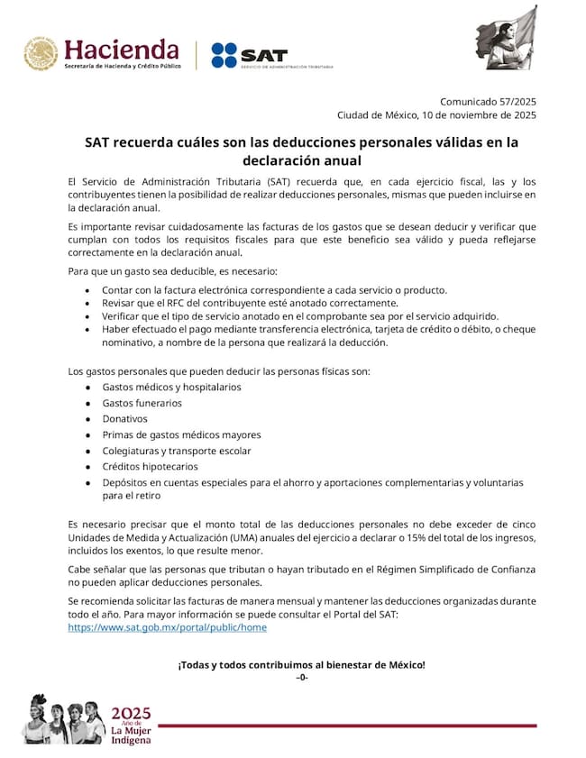 Eso sí, el SAT advierte que el monto total de las deducciones personales no puede pasarse de cinco Unidades de Medida y Actualización anuales o el 15% del total de tus ingresos, incluidos los exentos, lo que resulte menor.