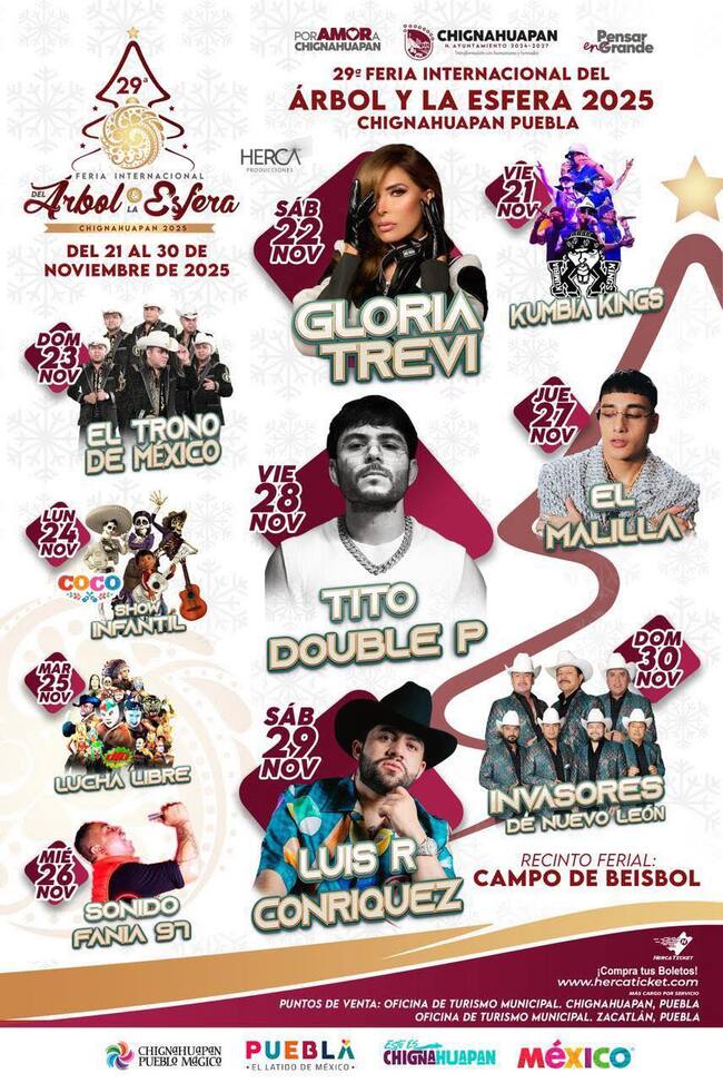La edición 29 de la Feria de Chignahuapan se realizará del 21 al 30 de noviembre de 2025 en el Recinto Ferial Campo de Béisbol, en el siguiente orden: