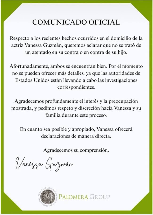 A través de un comunicado compartido en sus redes sociales, Guzmán, de 49 años, desmintió que se tratara de un ataque dirigido contra ella o su hijo, como se había difundido en redes sociales y algunos medios de comunicación.