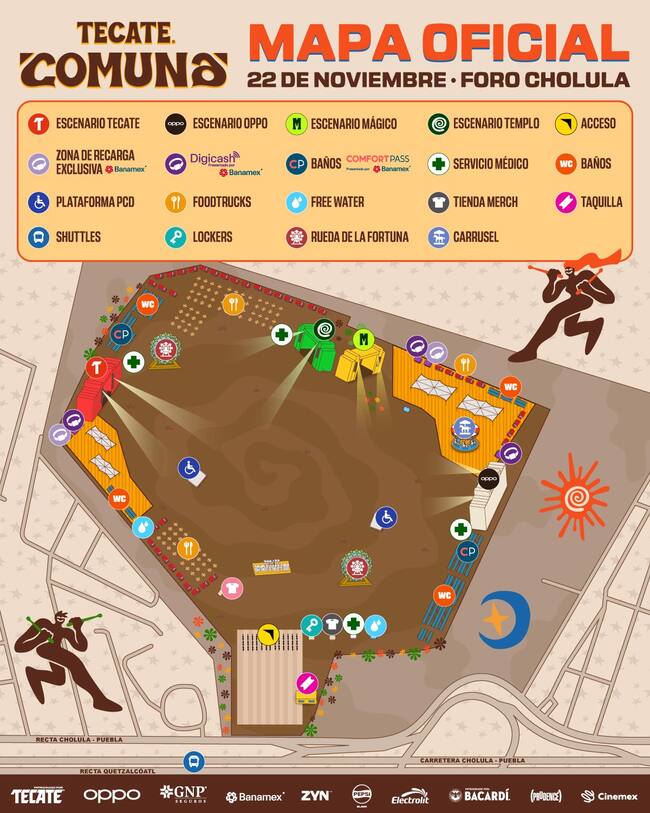 El festival también compartió el mapa oficial con zonas, accesos, barras, baños, puntos de hidratación y escenarios. Te lo dejamos aquí abajo para que vayas ubicando tus rutas dentro del Foro Cholula.