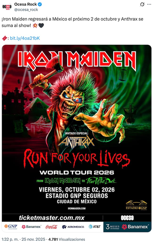 A muchos fans ya les entró la emoción por verde nuevo a la banda de heavy metal, y no es para menos. Sin embargo, la espera tendrá que ser larga pues Iron Maiden visitará tierras mexicanas hasta el 2 de octubre de 2026 en el Estadio GNP Seguros de la CDMX.