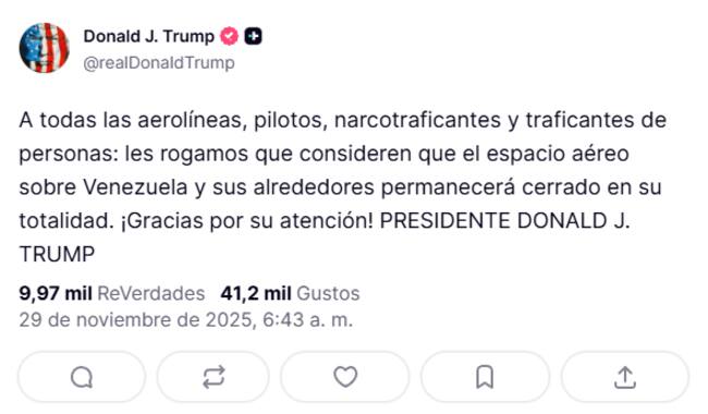 “A todas las aerolíneas, pilotos, narcotraficantes y traficantes de personas: les rogamos que consideren que el espacio aéreo sobre Venezuela y sus alrededores permanecerá cerrado en su totalidad. ¡Gracias por su atención!”.