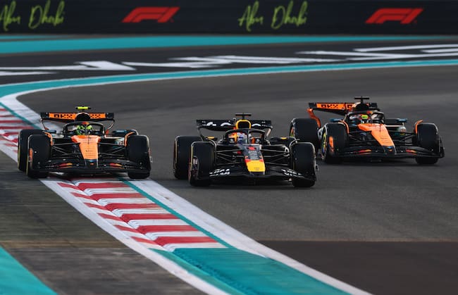 Max Verstappen de Países Bajos al volante del (1) Oracle Red Bull Racing RB21; Lando Norris de Gran Bretaña al volante del (4) McLaren MCL39 Mercedes y Oscar Piastri de Australia al volante del (81) McLaren MCL39 Mercedes en la vuelta de formación durante el Gran Premio de F1 de Abu Dabi en el Circuito de Yas Marina en Abu Dabi, Emiratos Árabes Unidos. (Foto de Clive Rose/Getty Images) / Clive Rose
