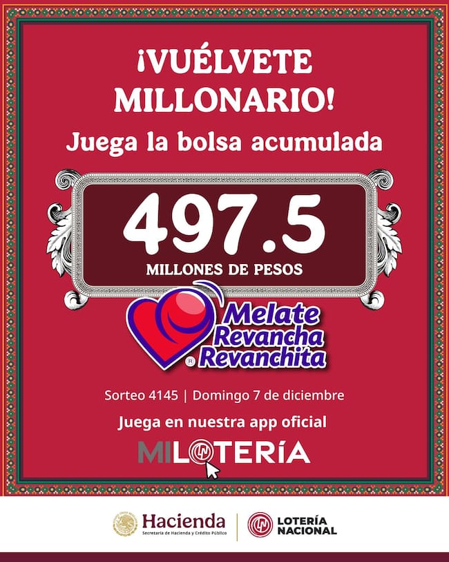 El próximo domingo 7 de diciembre, el sorteo Melate, Revancha y Revanchita No. 4145 tendrá una bolsa acumulada de 497 millones 500 mil pesos, una de las bolsas más grandes de este 2025. Con 15 pesos puedes participar por 219.7 mdp del sorteo Melate, con 10 pesos más participas por la bolsa de la Revancha que está en 150.4 mdp y agrega 5 pesos para participar por la Revanchita que tiene 127.4 mdp, sumando un total de 30 pesos que te pueden llevar a ser uno de los tantos ganadores de este sorteo electrónico.