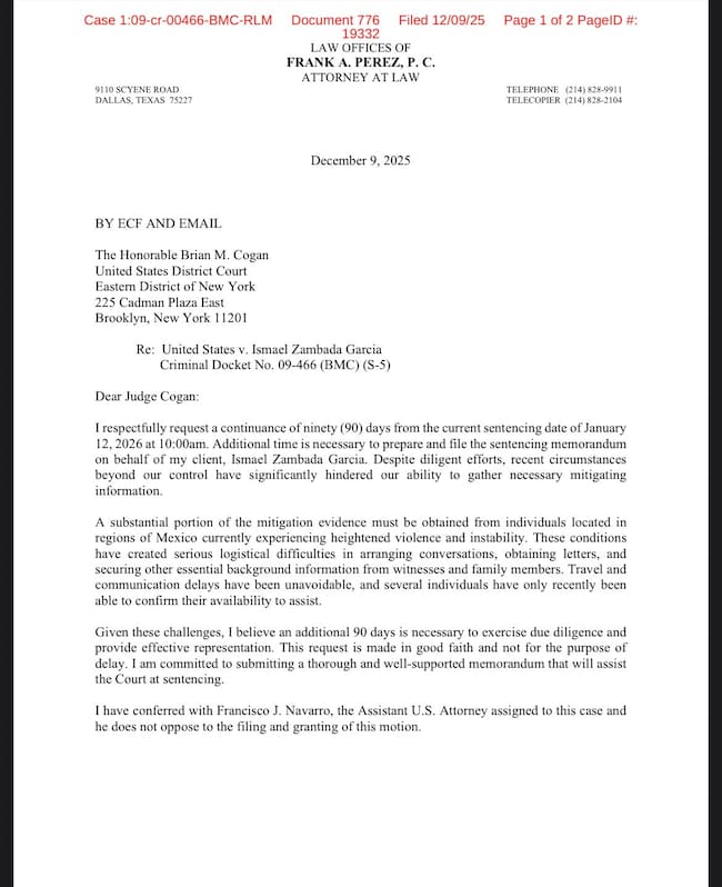 El abogado de Zambada, Frank Perez, reveló que la solicitud se debe a que las condiciones actuales en México de violencia obstaculizaron significativamente su capacidad para preparar un memorando de sentencia sólido.