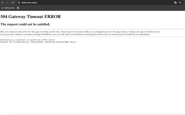 Error en Fanki a las 8:39 am: “504 Gateway Timeout ERROR”. Este último apunta a que “podría haber demasiado tráfico o un error de configuración”.