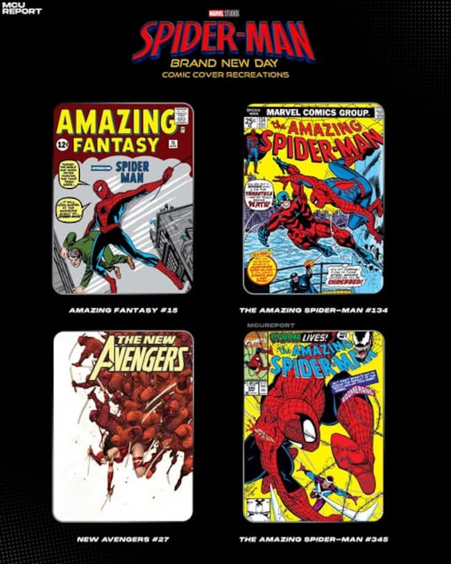 En cuanto a las imágenes, el tráiler incluye escenas que imitan portadas icónicas de los cómics, como la primera aparición del héroe en Amazing Fantasy #15, The Amazing Spider-Man #345 (donde se enfrenta a Boomerang), y The Amazing Spider-Man #134 (enfrentando a Tarantula). Todos siendo villanos confirmados junto con Michael Mando regresa como Mac Gargan, Escorpión, esta vez con su traje clásico.