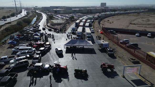 Agricultores del noroeste del estado de Chihuahua bloquearon los puentes internacionales de carga en Ciudad Juárez, México, el 3 de diciembre de 2025. (Foto de Christian Torres/Anadolu vía Getty Images) / Anadolu