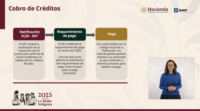 “Por lo que el mes que entra en enero de 2026, se requerirá el pago por 51 mil millones de pesos, conforme al código fiscal de la Federación En caso de intención de cubrir el adeudo, los contribuyentes podrán solicitar ante el SAT, dependiendo el orden y esquema de pago ajustes a la baja de hasta 39% conforme a la ley y a la sentencias de los tribunales”.