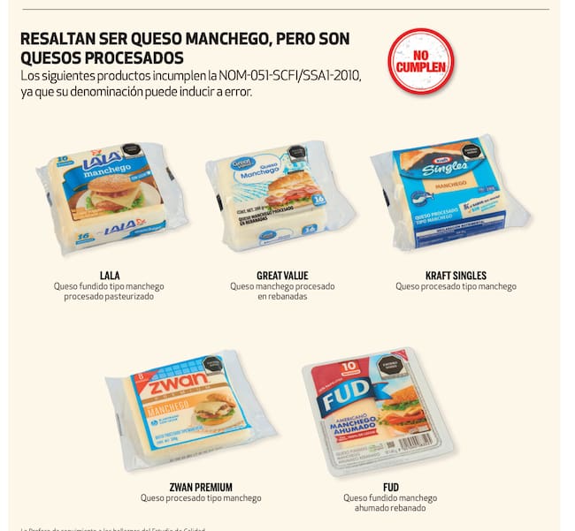 El resultado: cinco marcas populares que se venden como “manchego” no cumplen con lo que la mayoría de consumidores entiende como queso, sino que son quesos procesados o fundidos.