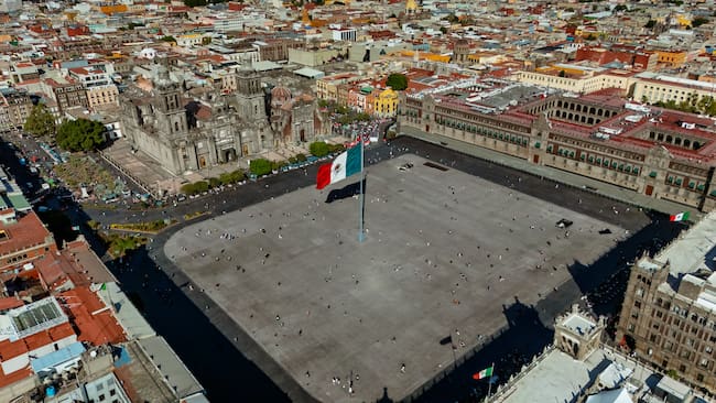 Aerial view of Mexico City's Zocalo with flag waving, Cathedral and National Palace / simonmayer