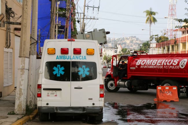 Bomberos de Protección Civil de Acapulco, resguardan la calle en donde un transformador de luz cayó sobre una ambulancia en el hospital privado Santa Lucía