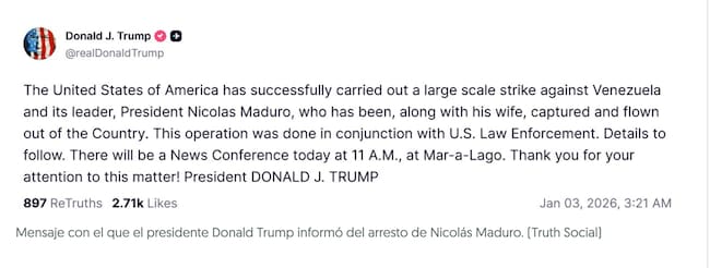 En su publicación, Trump afirmó que la detención ocurrió luego de operaciones militares dirigidas contra objetivos estratégicos, sin ofrecer detalles adicionales sobre el lugar, las fuerzas involucradas ni el estatus legal del presidente venezolano. Hasta el momento, no existe confirmación independiente por parte del gobierno de Venezuela, la Casa Blanca, el Pentágono o organismos internacionales.