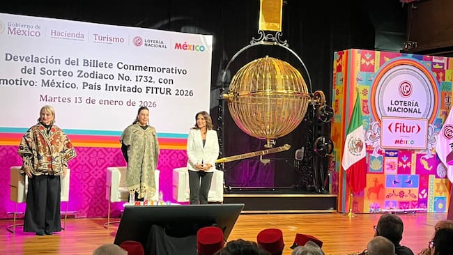 Este martes, Olivia Salomón, directora de la Lotería Nacional y la secretaria de Turismo, Josefina Rodríguez, develaron el billete conmemorativo: México, país invitado a la FITUR 2026.