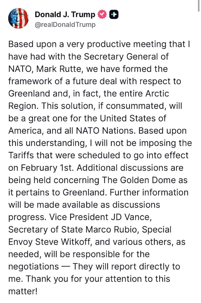 Además, informó que las discusiones sobre The Golden Dome respecto a Groenlandia continúan activas y también detalló que el vicepresidente JD Vance, el secretario de Estado Marco Rubio, así como el enviado especial Steve Witkoff, junto a otros funcionarios que se sumarán “según sea necesario”, serán los responsables de encabezar las negociaciones.