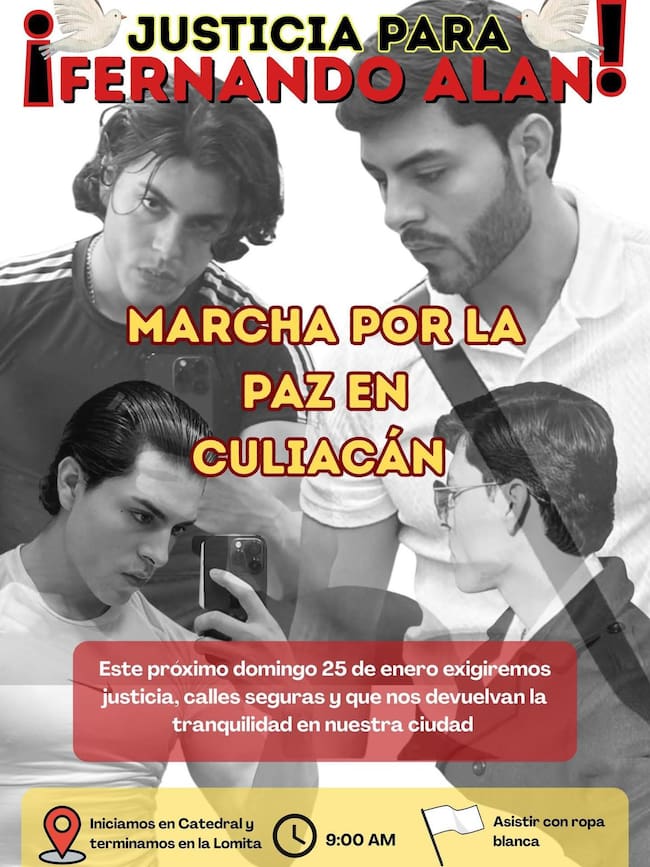 Amigos y familiares de Fernando Alan, quien era estudiante de derecho y fue asesinado el pasado 13 de enero en el sector Tierra Blanca, en Culiacán, convocaron a una marcha por la paz que se llevará a cabo este domingo 25 de enero.