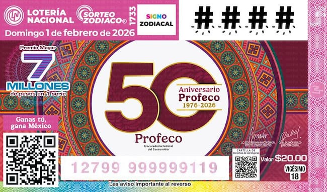 La directora Olivia Salomón subrayó que esta conmemoración llegará a miles de hogares llevando un mensaje claro y vigente: que en México los derechos del consumidor se protegen, la economía familiar se cuida y el Estado está presente del lado de la gente. En este contexto informó que el Sorteo Zodiaco No. 1733 se realizará el domingo 1 de febrero del presente año, en el Teatro de Lotería Nacional, en punto de las 20:00 horas; cuenta con un Premio Mayor de 7 millones de pesos en una serie y una bolsa repartible de 24 millones de pesos en premios.