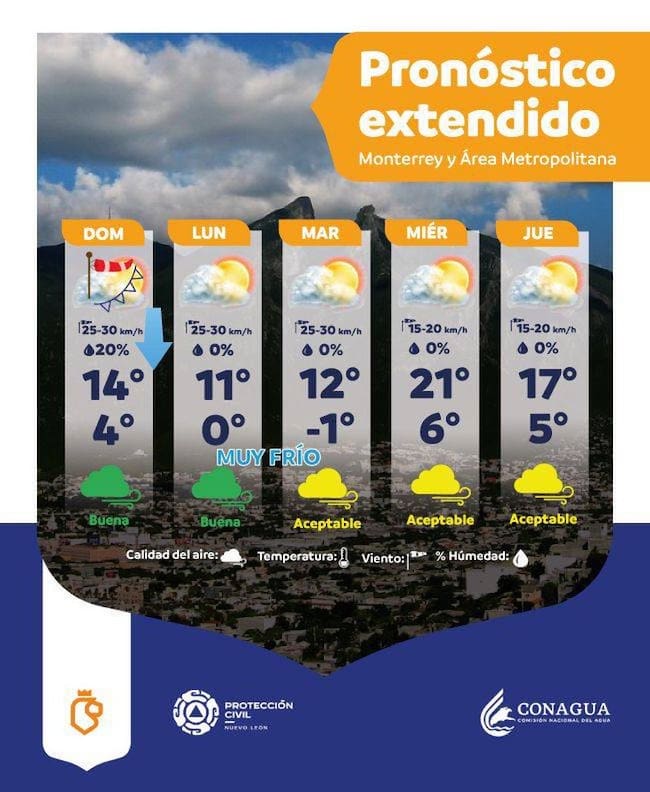 Aunque no se ha decretado una suspensión oficial de actividades, la alerta meteorológica se mantiene activa. Según datos de Protección Civil del Estado de Nuevo León, el termómetro bajará durante las próximas horas: