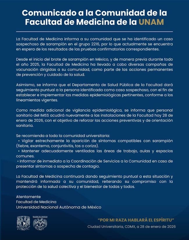 La Facultad de Medicina de la UNAM informó sobre un caso sarampión y activó medidas de vigilancia epidemiológica, con apoyo del IMSS desde este 28 de enero.