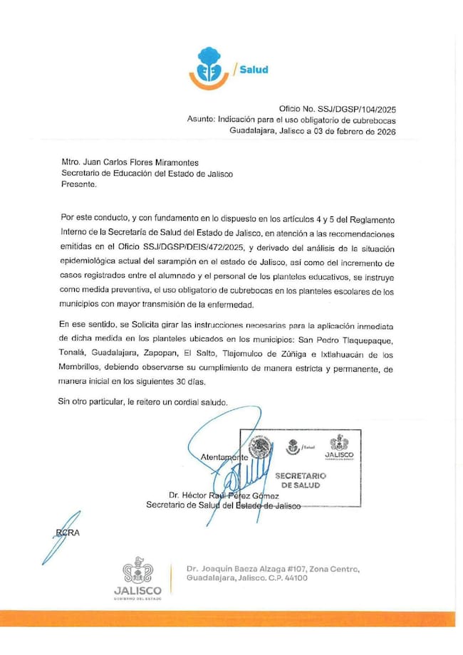 El gobierno de Jalisco decretó el uso obligatorio de cubrebocas en escuelas de varios municipios de la Zona Metropolitana de Guadalajara, como parte de las medidas para contener el aumento de casos de sarampión que enfrenta la entidad, donde se han registrado cientos de contagios activos en planteles educativos y la población en general.