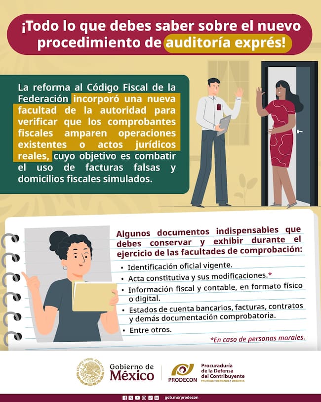 Si te llega una notificación de auditoría express, la Procuraduría de la Defensa del Contribuyente señala que, en el caso de las personas morales, deben tener a la mano y en orden lo siguiente: