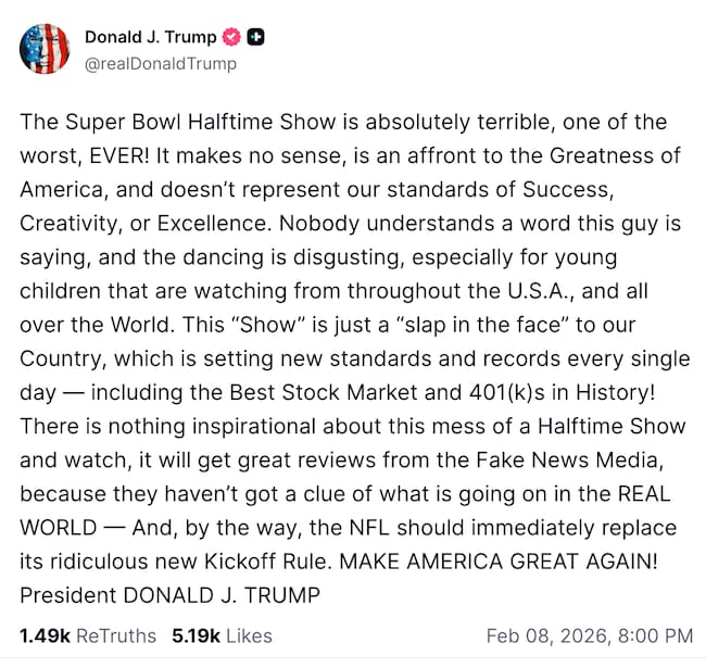 Trump fue más allá y acusó a los “medios de comunicación falsos” de aplaudir el show sin entender “lo que está pasando en el mundo real”. En el mismo mensaje, aprovechó para defender su gestión económica y lanzó dardos a la NFL, pidiendo reemplazar “de inmediato” la nueva regla de inicio, antes de cerrar con su lema: “¡HAGAMOS A ESTADOS UNIDOS GRANDE DE NUEVO!”.