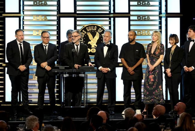 BEVERLY HILLS, CALIFORNIA - FEBRUARY 07: Paul Thomas Anderson (4th L) and team accept the Outstanding Directorial Achievement in Theatrical Feature Film for �One Battle After Another� onstage during the 78th Annual Directors Guild Of America Awards at The Beverly Hilton on February 07, 2026 in Beverly Hills, California. Kevin Winter/Getty Images for DGA/AFP (Photo by KEVIN WINTER / GETTY IMAGES NORTH AMERICA / Getty Images via AFP) / KEVIN WINTER