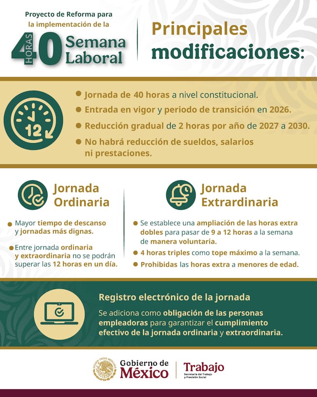 Checa los puntos sobre la entrada en vigor de la jornada laboral de 40 horas, la fecha de la primera reducción y etapas.