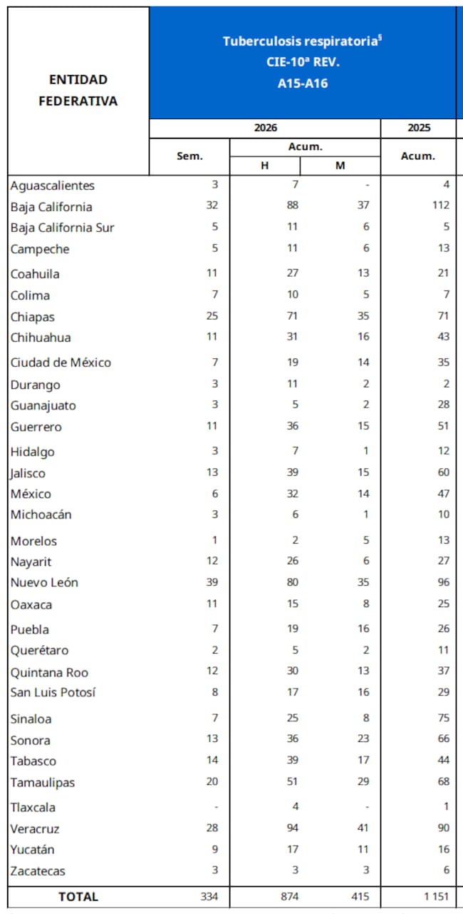 Hay diez estados que concentran la mayor carga de contagios de tuberculosis en lo que va de 2026: