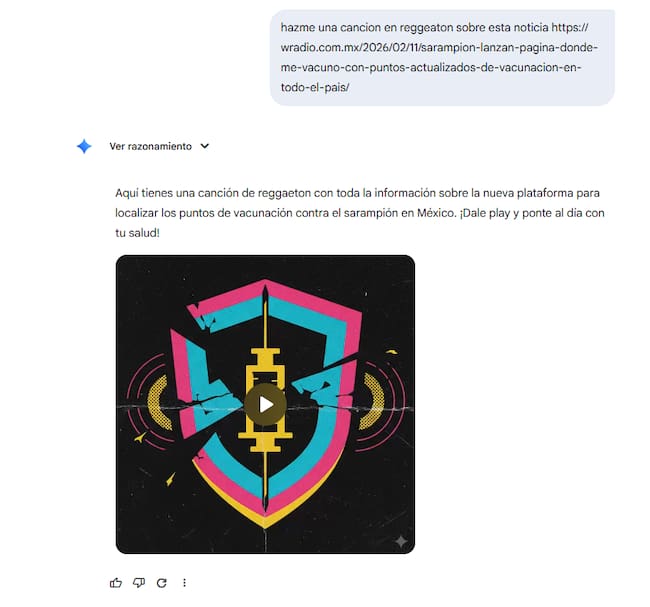 Nosotros ya tuvimos acceso a la herramienta y la probamos haciendo una canción bajo el siguiente prompt: “Hazme una canción en reggeaton sobre esta noticia: Sarampión: Lanzan página ‘¿Dónde me vacuno?’ con puntos actualizados de vacunación en todo el país” y el resultado fue algo muy bien elaborado que tomo como referencia los datos relevantes de nuestra nota.