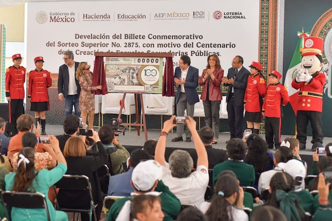 Al agradecer a la Lotería Nacional la develación del billete alusivo a los 100 años de historia de la escuela secundaria pública, señaló que este acto anima y enorgullece, pues reconoce la trascendencia histórica, social y educativa de este nivel en el desarrollo del país, así como su papel fundamental en la construcción de una educación incluyente, equitativa y transformadora.