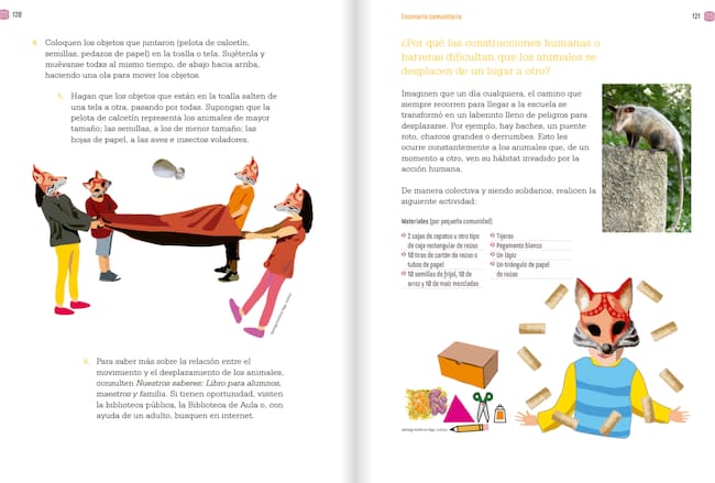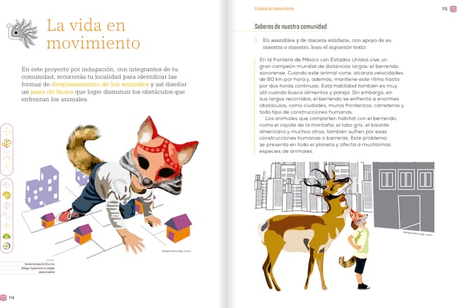 Páginas del libro Proyectos Comunitarios de tercer grado de la SEP, donde ilustraciones sobre el desplazamiento de animales fueron asociadas en redes con el concepto de “therians”.