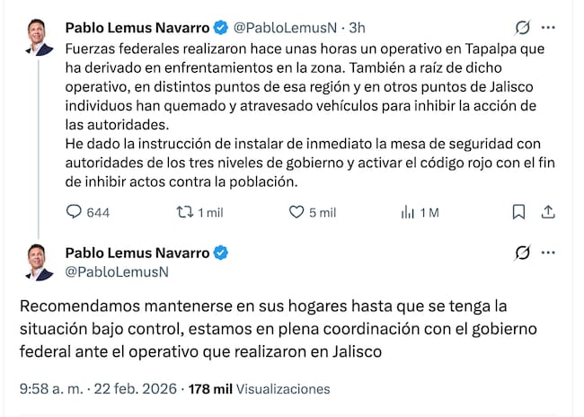 Operativo en Jalisco: Gobernador, Pablo Lemus, pide a la población resguardarse y lanza recomendaciones de seguridad