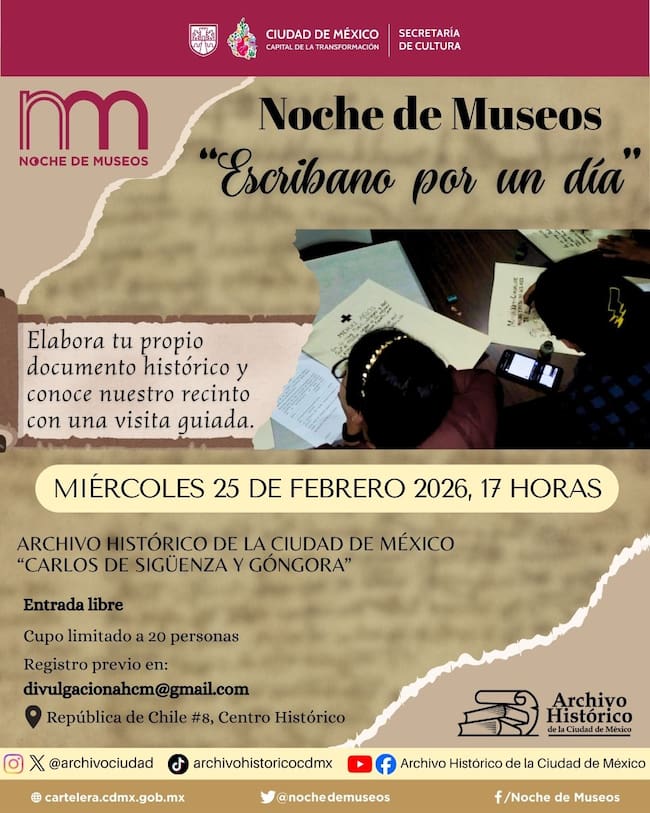 ¿Quieres sentirte escribano por un día? Aquí podrás hacerlo realidad escribiendo tu propio documento histórico y lo mejor, es que conocerás el recinto con una visita guiada. ¡Si! Es un 2x1. Así que tomará lugar a las 5 PM y deberás apurarte porque el cupo es solo para 20 personas, recuerda que es gratis.