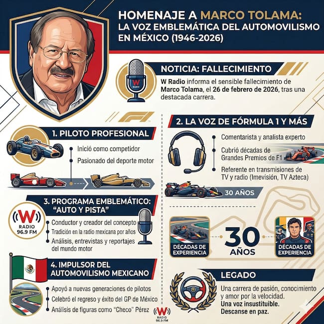 Marco Tolama, referente de la Fórmula 1 en México y conductor de “Auto y Pista” en W Radio, falleció tras permanecer hospitalizado en terapia intensiva durante varias semanas.
