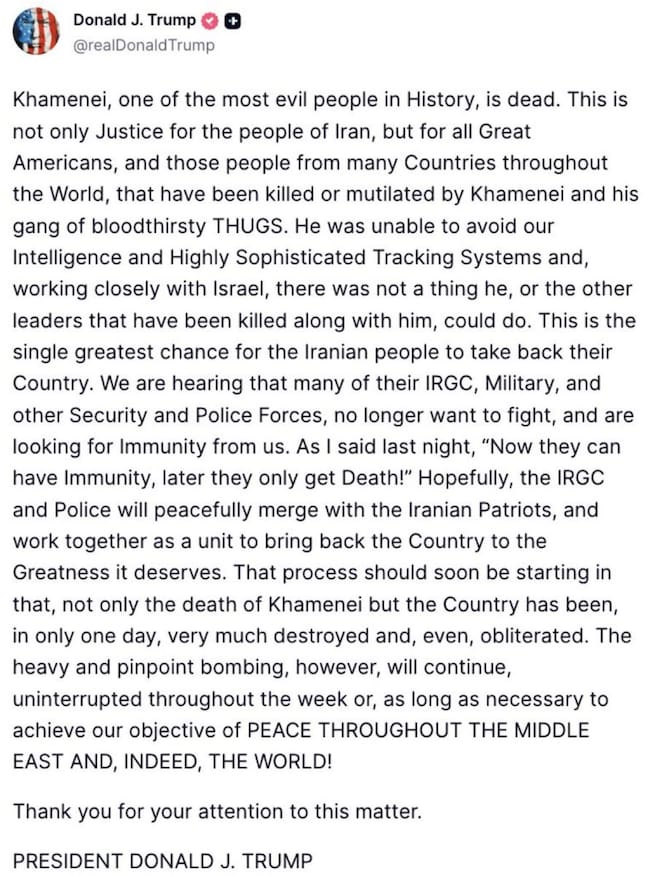 En su publicación, Trump escribió que Jamenei había sido abatido en los ataques coordinados entre Estados Unidos e Israel, y que esto podría ofrecer “la mayor oportunidad en generaciones para que el pueblo iraní recupere su país”. Aunque el tono de su mensaje fue afirmativo, fuentes periodísticas, como el medio británico The Guardian, destacan que la declaración no incluyó pruebas verificables independientemente de la muerte del líder supremo.
