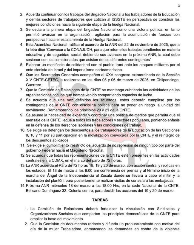 La Asamblea Nacional Representativa (ANR) del magisterio disidente determinó que el próximo 18 de marzo se realizará una movilización que partirá del Ángel de la Independencia al Zócalo capitalino donde se instalará un plantón, así como un paro de labores que iniciará el mismo día y finalizará el 20 de marzo.
