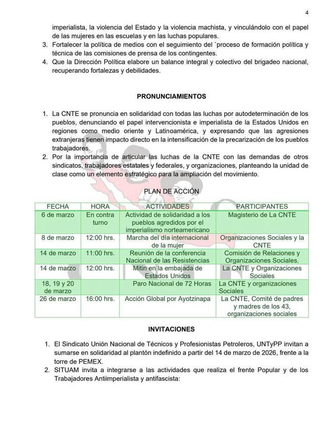 Además, la ANR presentó un plan de acción que contempla su asistencia a la Marcha del Día Internacional de la Mujer el 8 de marzo; un mitin en la Embajada de Estados Unidos el 14 de marzo; la Acción Global por Ayotzinapa el 26 de marzo; la Reunión de la Conferencia Nacional de las Resistencias el 14 de marzo; y la actividad de solidaridad a los pueblos agredidos por el imperialismo norteamericano el 6 de marzo.