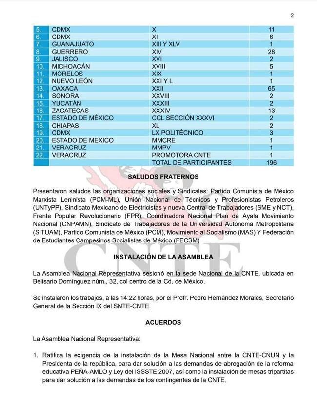Las exigencias son instalar una mesa una Mesa Nacional entre la CNTE-CNUN y la presidenta Claudia Sheinbaum para dar solución a las demandas de abrogación de la reforma educativa PENA-AMLO, la Ley del ISSSTE 2007 y la instalación de mesas tripartitas.