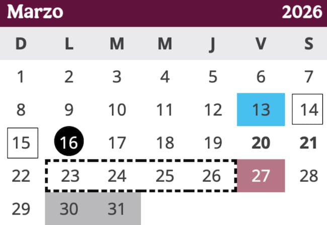 Los días de marzo que no hay clases en 2026 son: