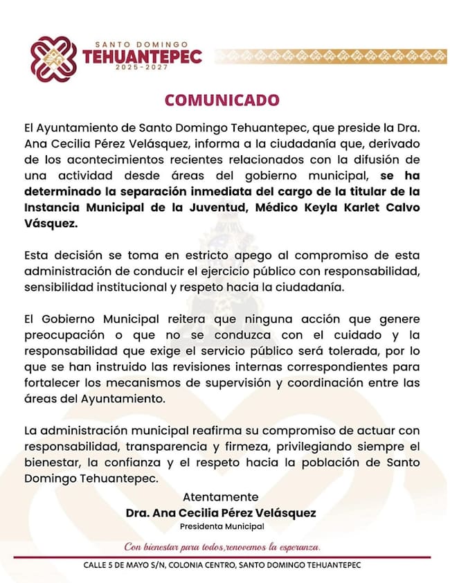 Con este comunicado, el gobierno de Ana Cecilia Pérez Velázquez se deslindó de toda responsabilidad, e incluso de la promotora, la titular de Juventud del municipio.