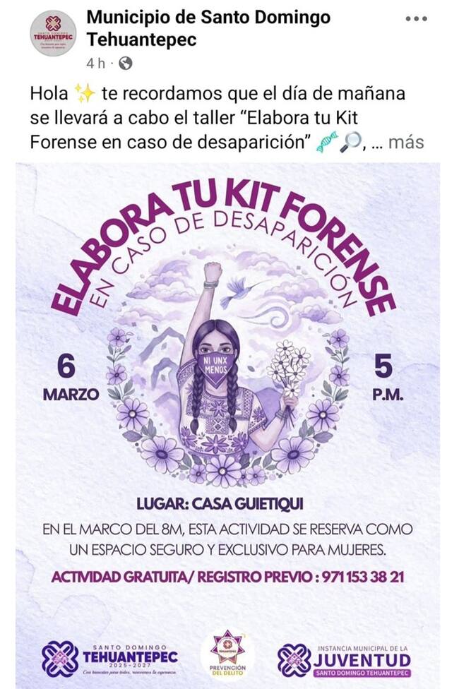 El kit forense de la bióloga y activista Becky Bios fue promovido por el gobierno municipal de Santo Domingo Tehuantepec, Oaxaca sin autorización.