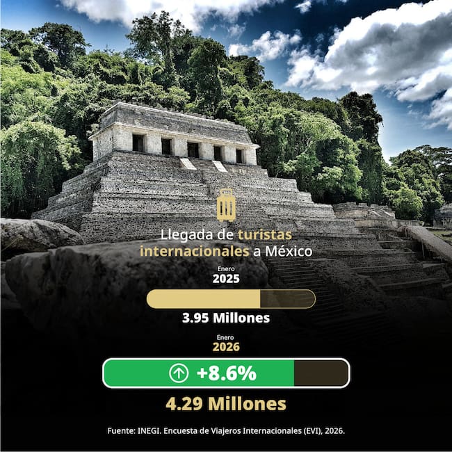 - De acuerdo con la Encuesta de Viajeros Internacionales (EVI) 2026 del INEGI, en enero se registró el arribo de 4.29 millones de turistas a México, lo que representa un incremento de 8.6 por ciento en comparación con el mismo mes de 2025