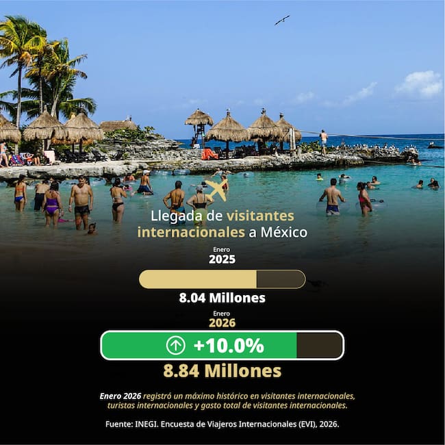 La secretaria de Turismo del Gobierno de México, Josefina Rodríguez Zamora, dio a conocer que este enero de 2026 registró los niveles más altos para este primer mes de un año desde que se tiene registro en los principales indicadores del turismo internacional, al reportarse la llegada de 8.84 millones de visitantes internacionales a México, es decir, un incremento de 10 por ciento en comparación con el mismo periodo del año anterior.