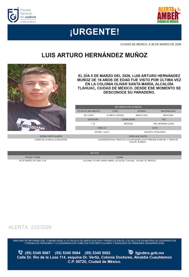 La desaparición de Luis Arturo Hernández Muñoz, un estudiante de 16 años, ha generado preocupación en la Ciudad de México luego de que fuera visto por última vez al ingresar a la estación Tláhuac del Metro, en la alcaldía del mismo nombre. Desde entonces, su familia y autoridades mantienen una búsqueda activa para localizarlo y esclarecer qué ocurrió después de que entró al sistema de transporte.