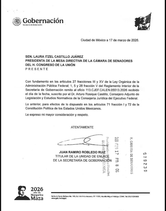 La presidenta del Senado, Laura Itzel Castillo, informó que la misma Consejería envió un documento para que el Senado como Cámara de origen subsane el error.
